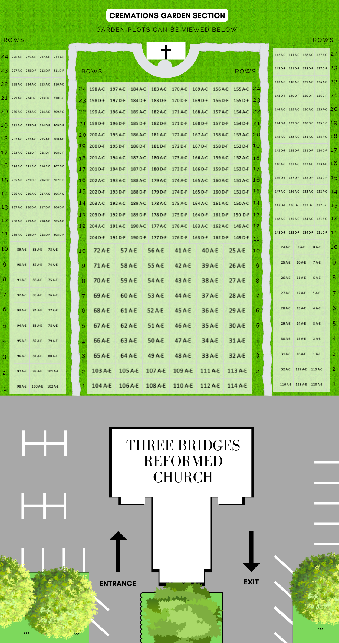 The map below is a full list of all plots on the cemetery grounds. It does not reflect current availability, nor the location of plots that are occupied. If you have any questions, including location requests for an occupied plot, or would like to inquire of availability, please click the contact button below to reach out to our church cemetery commission.